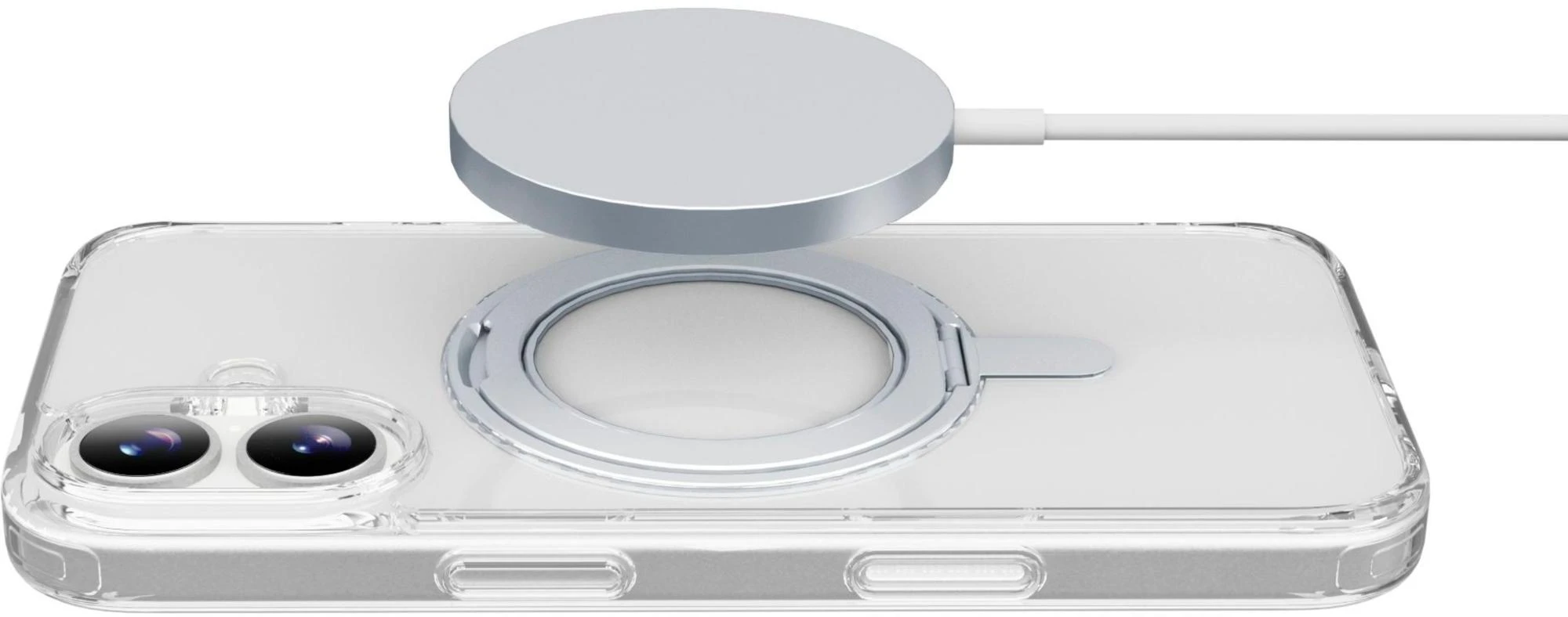 SPIN MAG ist die transparente Hülle mit drehbarem Ständer, die mit dem MagSafe-System kompatibel ist. Es zeichnet sich durch einen um 360 Grad drehbaren Ring aus, der es dem Gehäuse ermöglicht, verschiedene Funktionen wie Stand- und Halterungsfunktionen zu übernehmen. Der Ring ist integriert und wird bei Nichtgebrauch zu einem integralen Bestandteil des Gehäuses, sodass es mit MagSafe-Zubehör kompatibel ist. Die erhöhten Kanten rund um das Display und die Kamerabereiche schützen das Telefon vor versehentlichen Stößen und Stürzen.