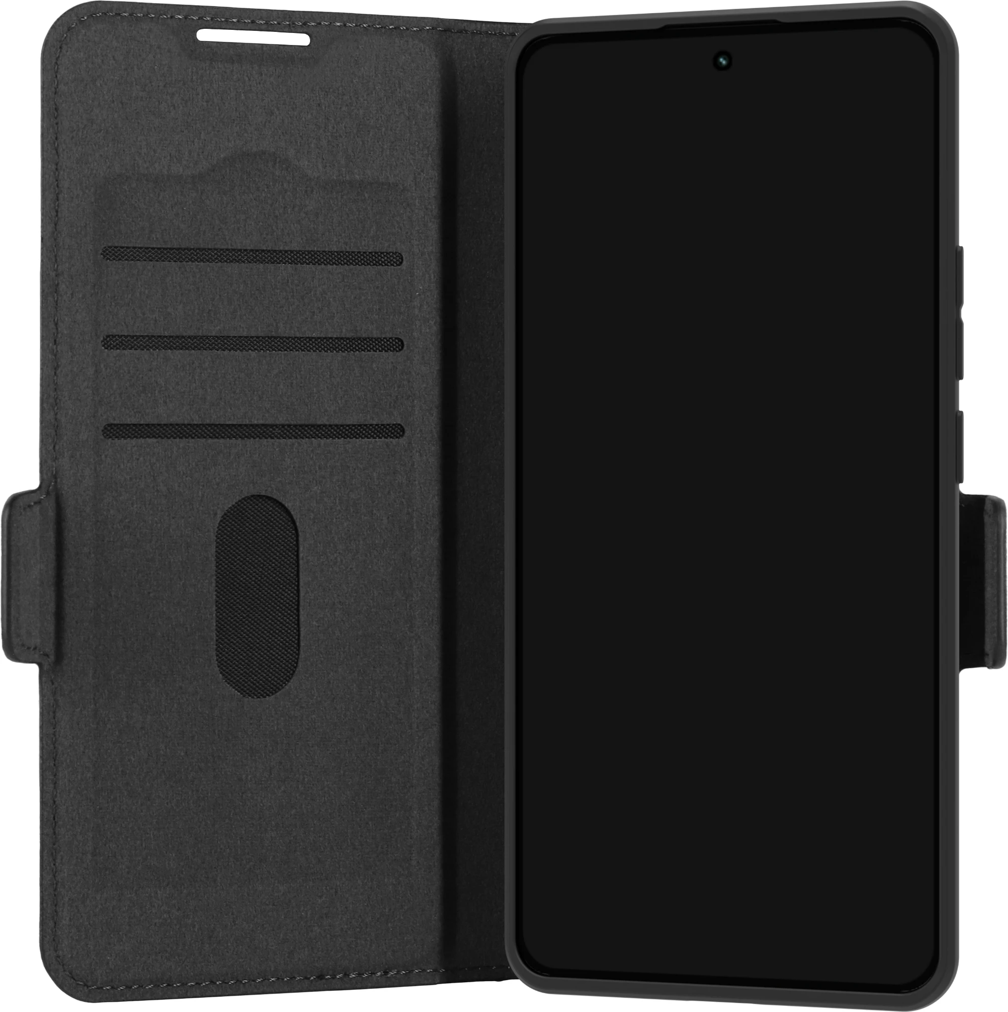 Die Klapphülle umfasst drei Kartenfächer mit Platz für bis zu fünf Kreditkarten und einen Magnetverschluss zur sicheren Aufbewahrung. Die faltbare Rückseite dient auch als horizontaler Ständer für freihändiges Videoschauen.